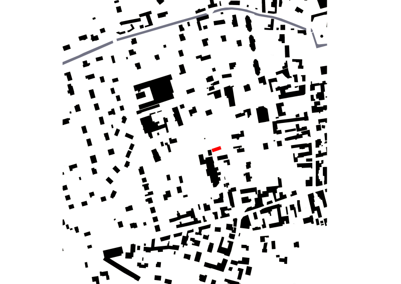 Un premier volume, aligné aux pignons et proche du portail commun d’entrée, constitue le bâtiment d’accueil. Par son implantation, il définit une zone arrière (en jaune), destinée à l’usage du personnel. Il laisse également la vue existante, sur le pignon en rez-de-chaussée, dégagée. Un second bâtiment, plus important et englobant les salles de classes, est séparé du premier par un espace extérieur de préau couvert. L’ensemble des modules restent alignés, pour faciliter la mise en œuvre cohérente des fondations.
