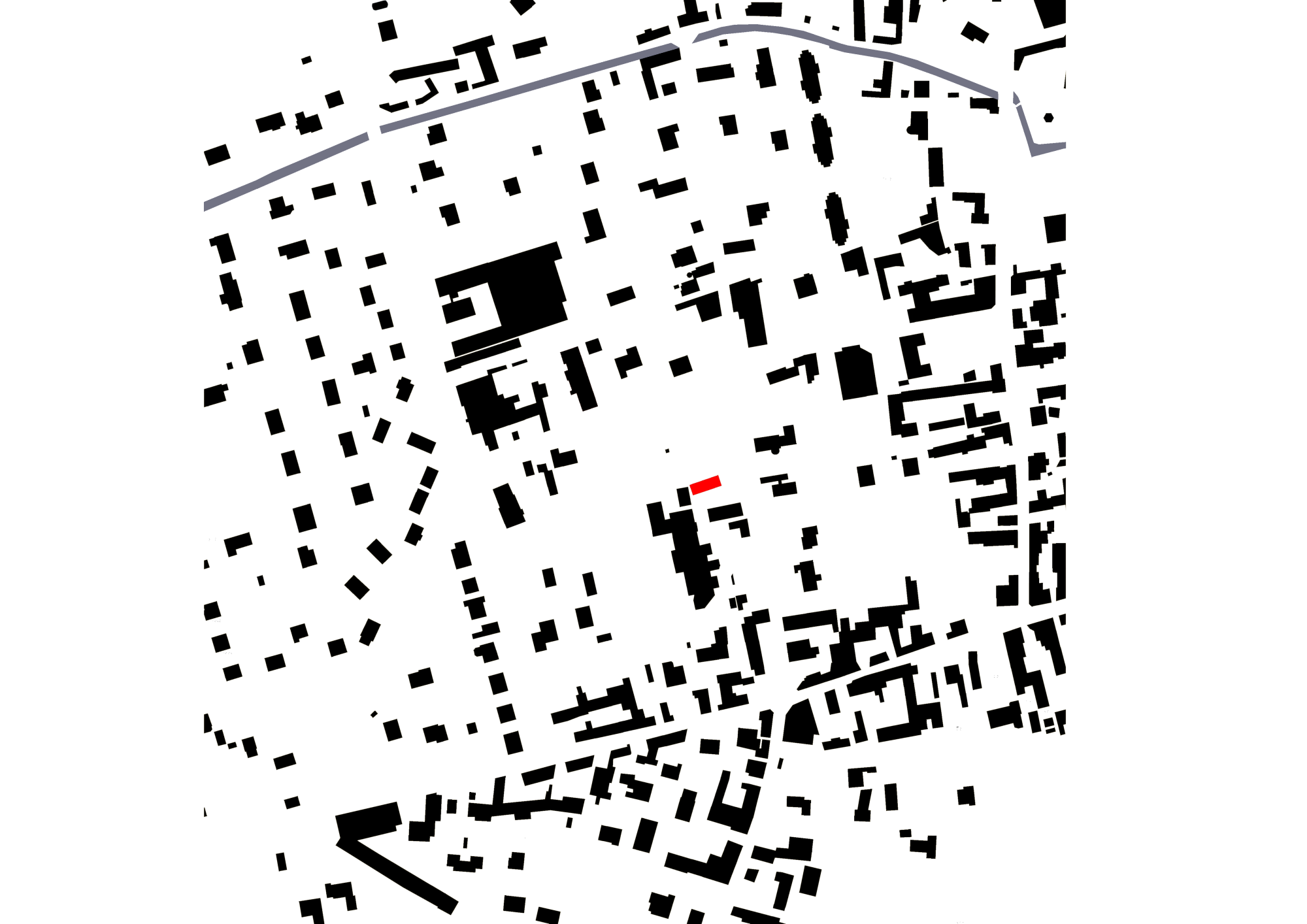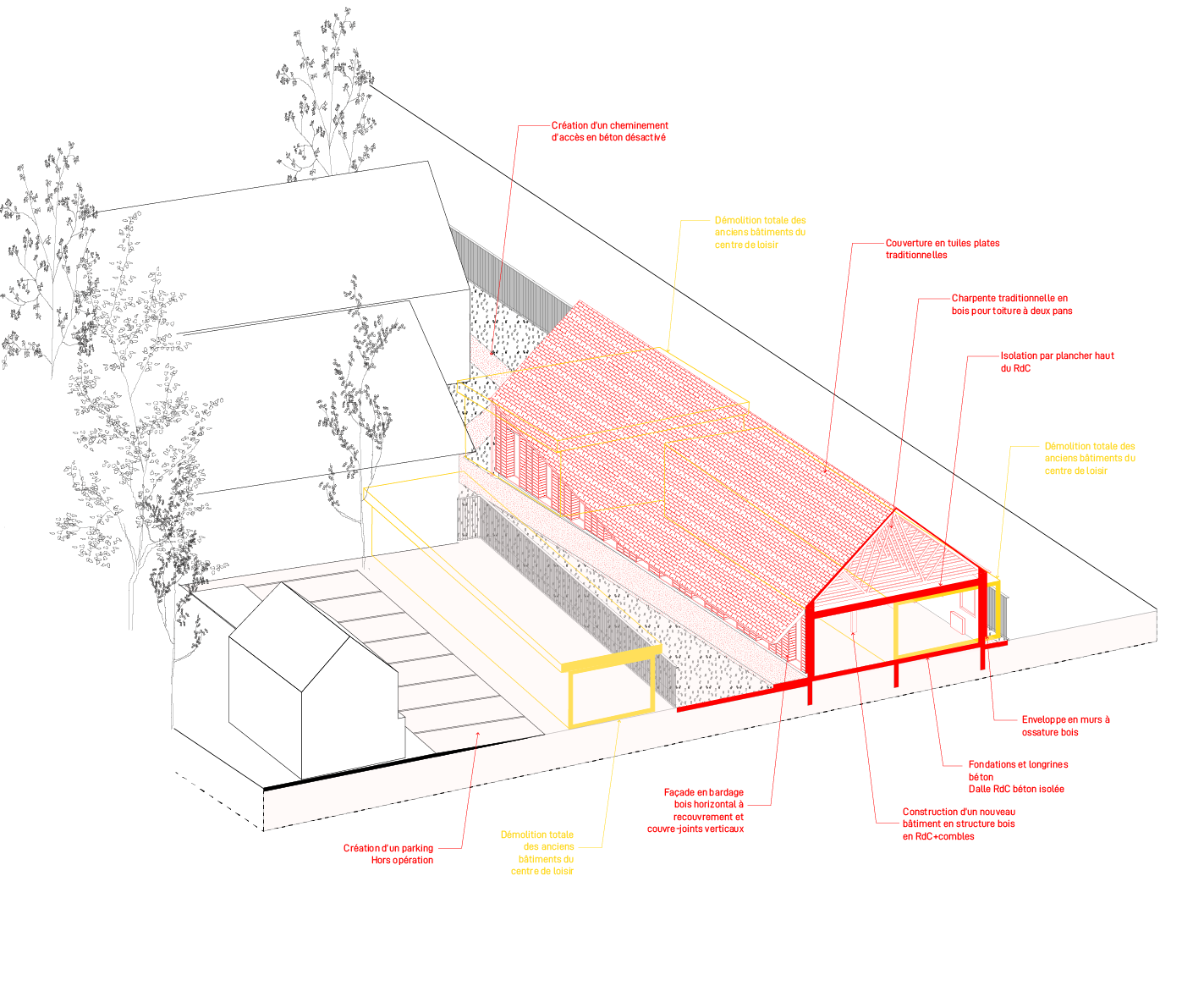 Un premier volume, aligné aux pignons et proche du portail commun d’entrée, constitue le bâtiment d’accueil. Par son implantation, il définit une zone arrière (en jaune), destinée à l’usage du personnel. Il laisse également la vue existante, sur le pignon en rez-de-chaussée, dégagée. Un second bâtiment, plus important et englobant les salles de classes, est séparé du premier par un espace extérieur de préau couvert. L’ensemble des modules restent alignés, pour faciliter la mise en œuvre cohérente des fondations.